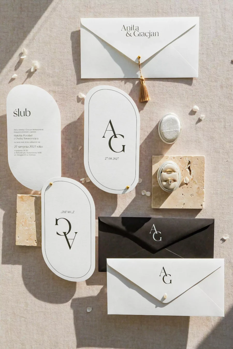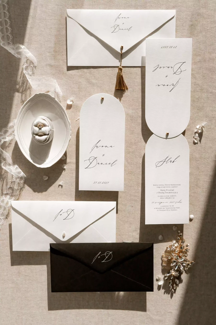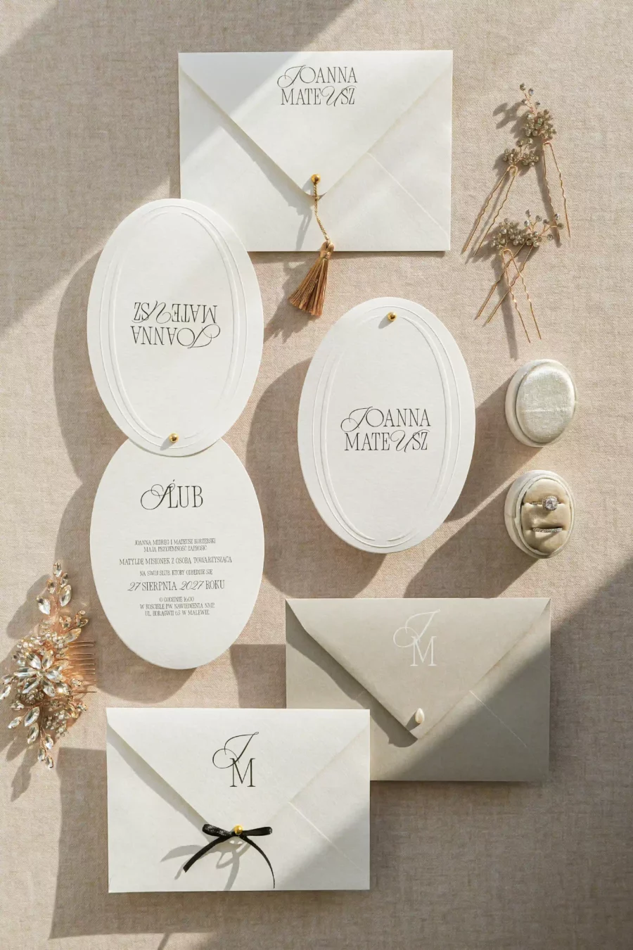 Na zdjęciach prócz zaproszenia widoczne są dwie koperty z różnymi możliwościami druku, pierwszy przykładowy wariant z drukiem na froncie, drugi na klapce koperty.