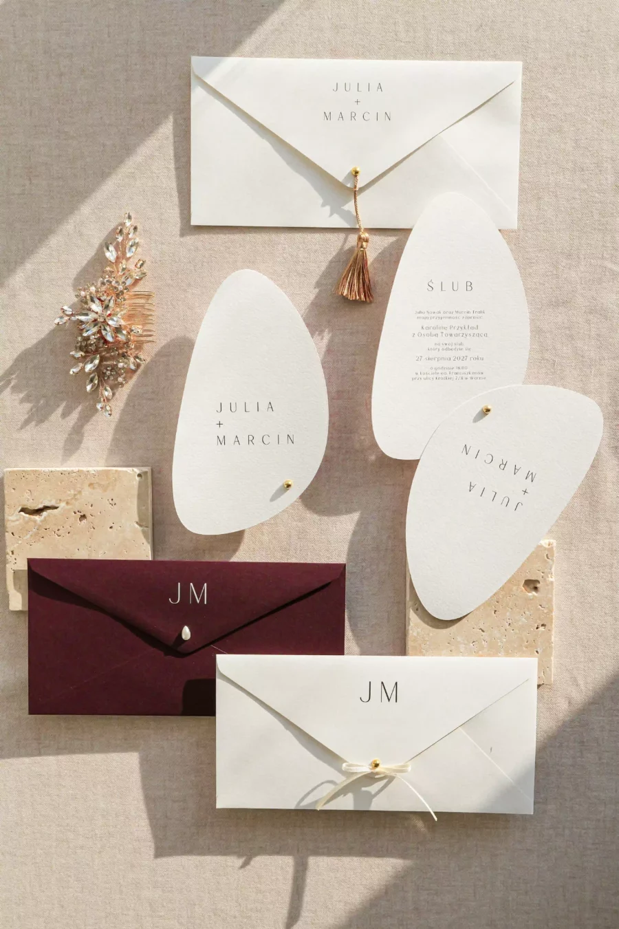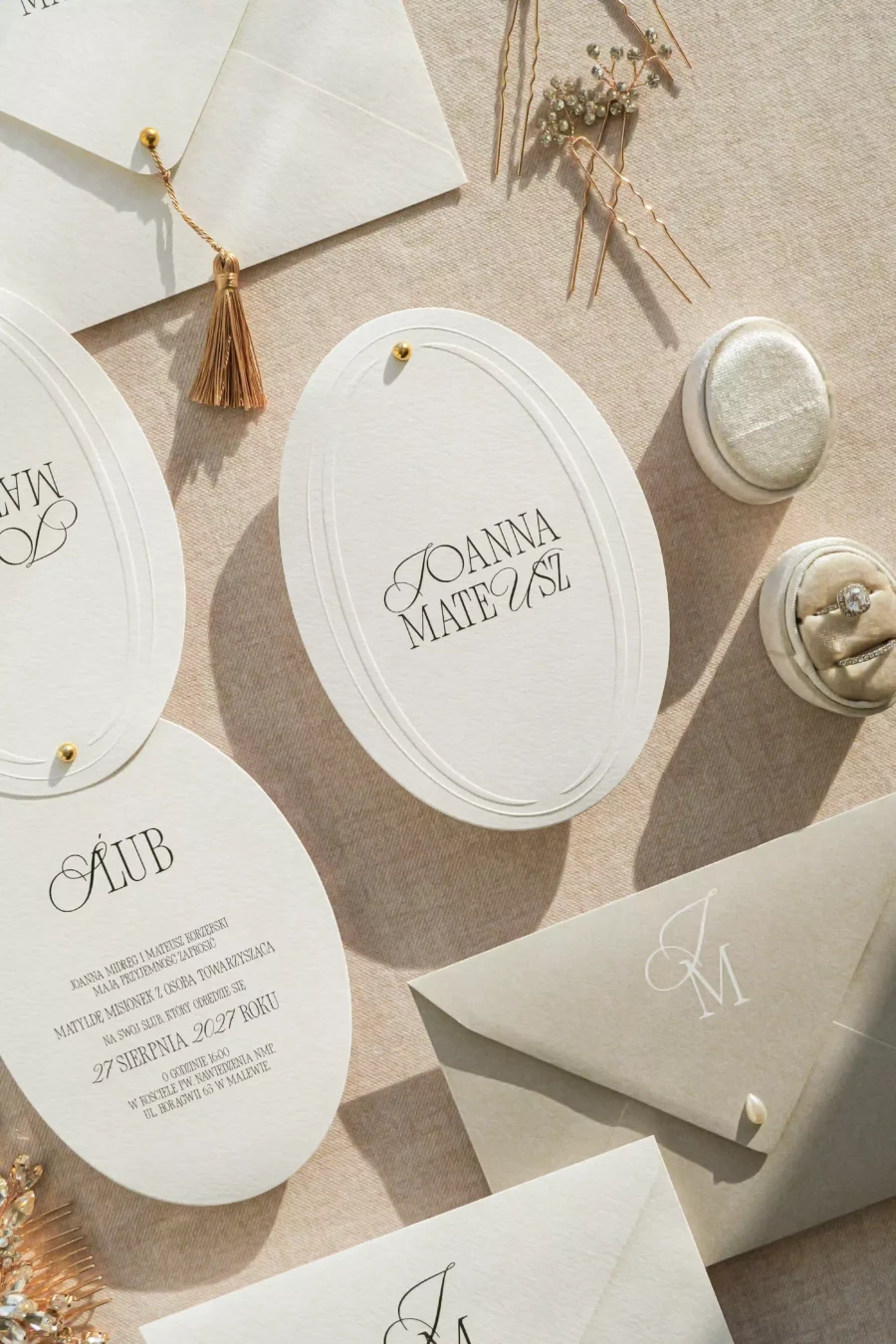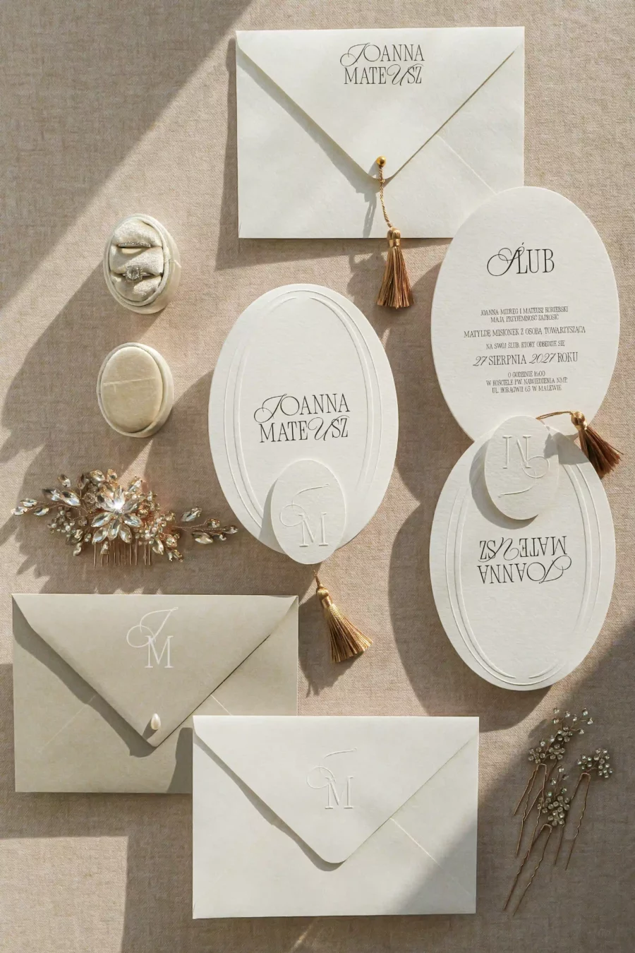 Na zdjęciach prócz zaproszenia widoczne są dwie koperty z różnymi możliwościami druku, pierwszy przykładowy wariant z drukiem na froncie, drugi na klapce koperty.