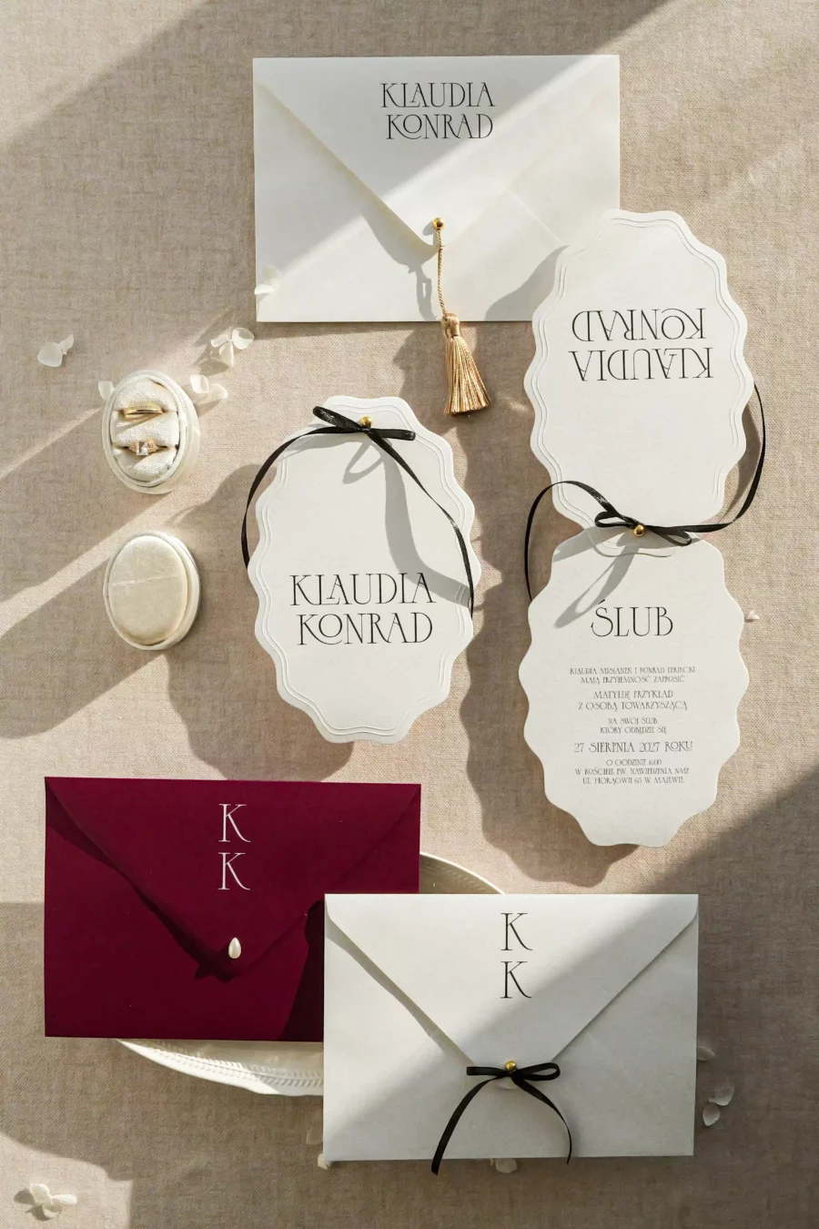 Na zdjęciach prócz zaproszenia widoczne są trzy koperty z różnymi możliwościami druku, pierwszy przykładowy wariant z drukiem na froncie, drugi na klapce koperty, oraz z opcją kokardki.