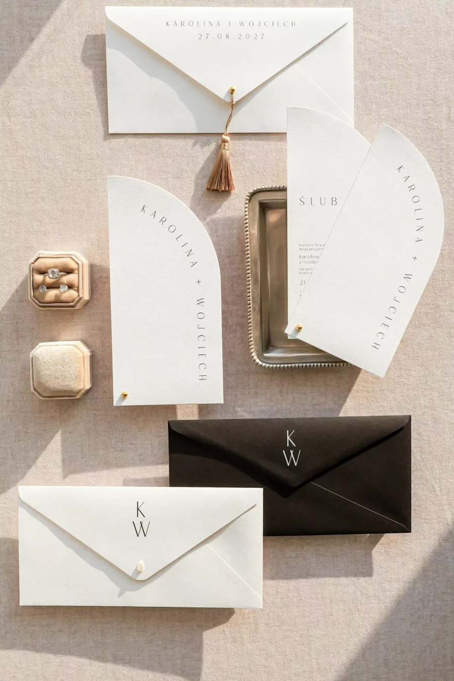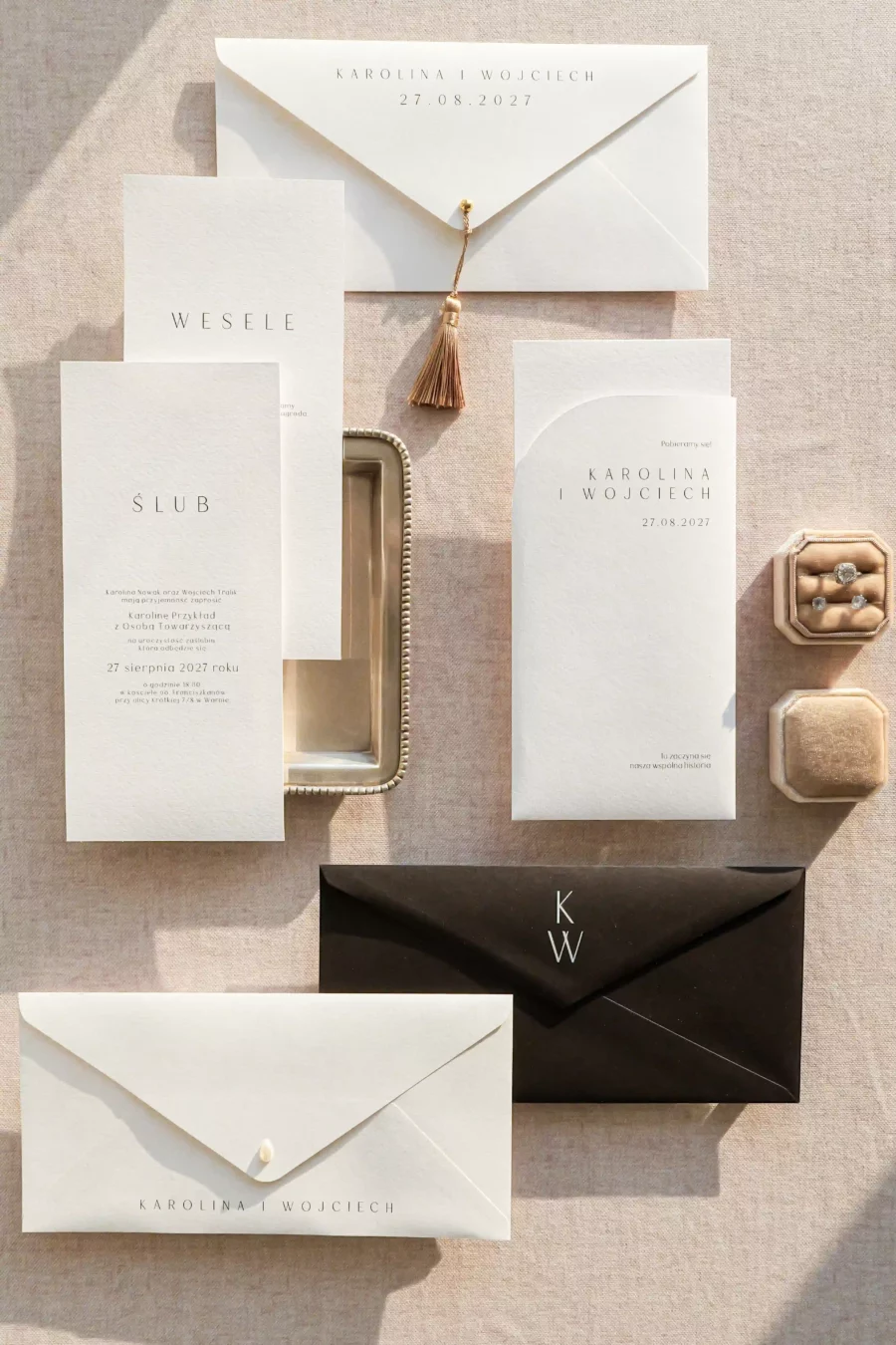 Na zdjęciach prócz zaproszenia widoczne są dwie koperty z różnymi możliwościami druku, pierwszy przykładowy wariant z drukiem na froncie, drugi na klapce koperty.