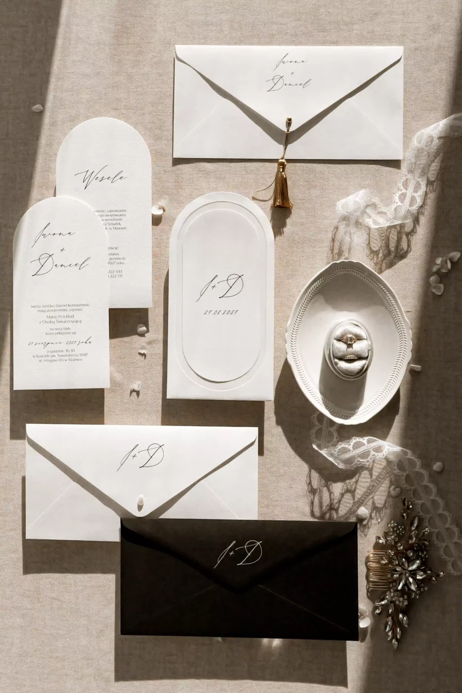 Jedno- lub dwukartowe zaproszenie z treścią drukowaną na papierze fakturowanym o gramaturze 250 g/m2. Obie karty umieszczone w personalizowanym folderze.