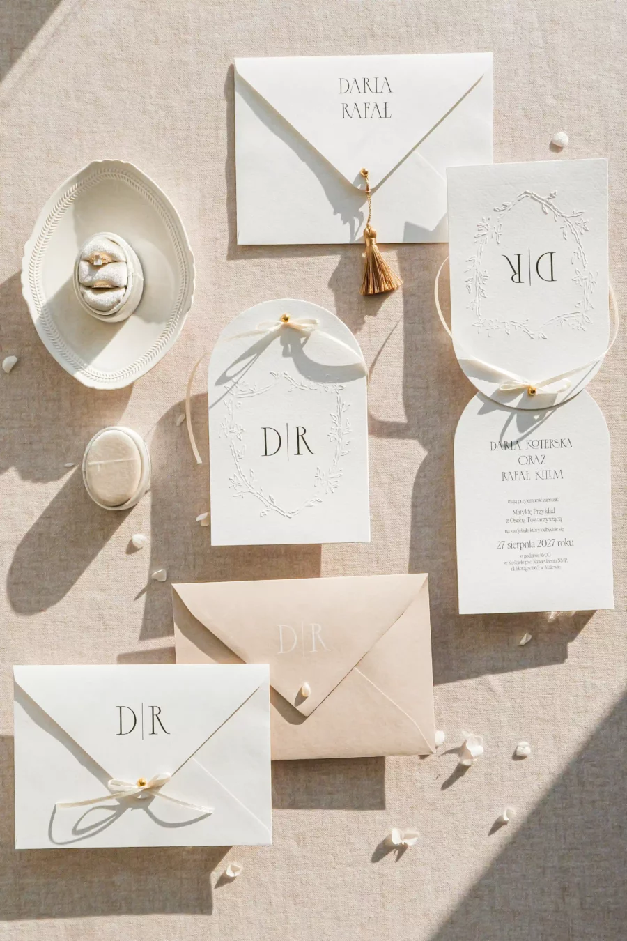 Dwustronne zaproszenie z treścią drukowaną na fakturowanym papierze o gramaturze 250 g/m2 z tłoczonymi inicjałami pary młodej na froncie i nagłówkiem “wesele” na odwrocie.