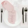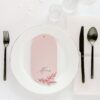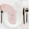 Dwu- lub trzykartowe Menu leżące z treścią drukowaną na papierze w kolorze pudrowego różu o gramaturze 220 g/m2 i drukiem w kolorze burgundowym. Przeznaczone do położenie na nakryciach gości. Łączenie kart w kolorze złotym lub srebrnym do wyboru.