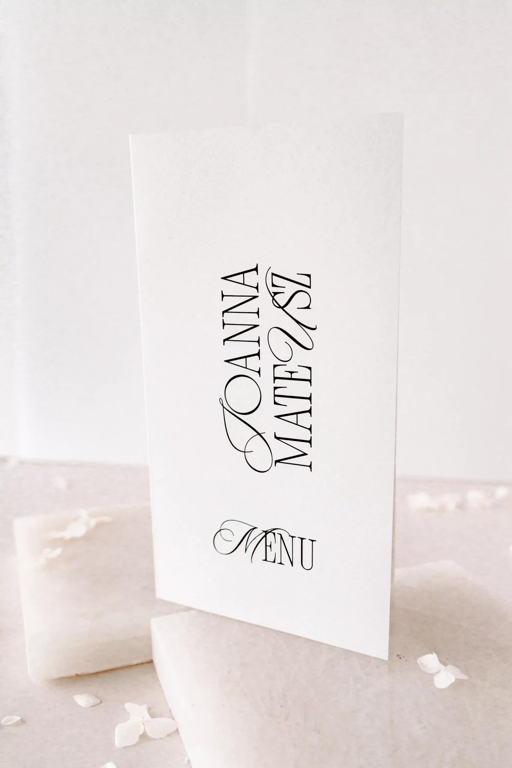 Rozkładane menu przygotowane na fakturowanym papierze o gramaturze 250 g/m2. Czarny druk.