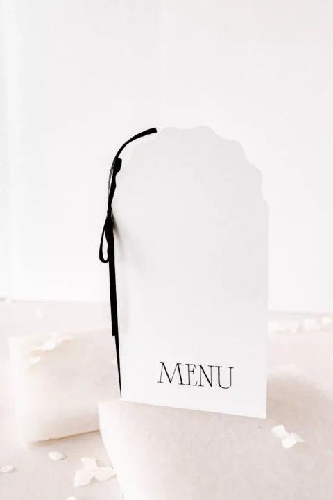 Rozkładane menu przygotowane na fakturowanym papierze o gramaturze 250 g/m2. Falowana górna część, czarny druk.