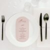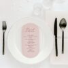 Menu leżące, będące równocześnie winietką z treścią drukowaną na papierze w kolorze pudrowego różu o gramaturze 220 g/m2, druk w kolorze burgundowym. Przeznaczone do położenie na nakryciach gości.