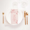 Delikatne menu będące równocześnie winietką z treścią drukowaną na papierze w kolorze pudrowego różu o gramaturze 220 g/m2, z dartymi ręcznie brzegami i motywem magnolii. Treść w kolorze burgundowym.