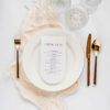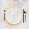 Minimalistyczne menu leżące, będące równocześnie winietką z treścią drukowaną na fakturowanym papierze o gramaturze 250 g/m2. Przeznaczone przykładowo do położenie na nakryciach gości. Jednostronne z możliwością przygotowania treści dwustronnie.