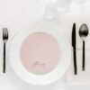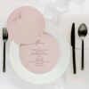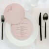 Dwu- lub trzykartowe Menu leżące, będące równocześnie winietką z treścią drukowaną na papierze w kolorze pudrowego różu o gramaturze 220 g/m2, druk w kolorze burgundowym. Przeznaczone do położenie na nakryciach gości. Łączenie kart w kolorze złotym lub srebrnym do wyboru.