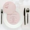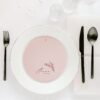 Dwu- lub trzykartowe Menu leżące, będące równocześnie winietką z treścią drukowaną na papierze w kolorze pudrowego różu o gramaturze 220 g/m2, druk w kolorze burgundowym. Przeznaczone do położenie na nakryciach gości. Łączenie kart w kolorze złotym lub srebrnym do wyboru.