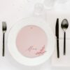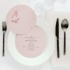 Dwu- lub trzykartowe Menu leżące z treścią drukowaną na papierze w kolorze pudrowego różu o gramaturze 220 g/m2, druk w kolorze burgundowym. Przeznaczone do położenie na nakryciach gości. Łączenie kart w kolorze złotym lub srebrnym do wyboru.