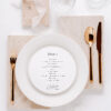 Minimalistyczne, okrągłe, dwustronne menu leżące będące równocześnie winietką z treścią drukowaną na fakturowanym papierze o gramaturze 250 g/m2.