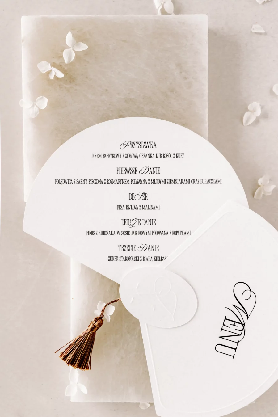 Stojące menu będące równocześnie numerem stołu przygotowane na fakturowanym papierze o gramaturze 250 g/m2 o nowoczesnym kształcie łuku. na jednej ściance umieszczone jest menu, na pozostałych dwóch numer stołu. Przygotowane do samodzielnego złożenia (wysyłane do klienta w formie „płaskiej” rozłożonej)