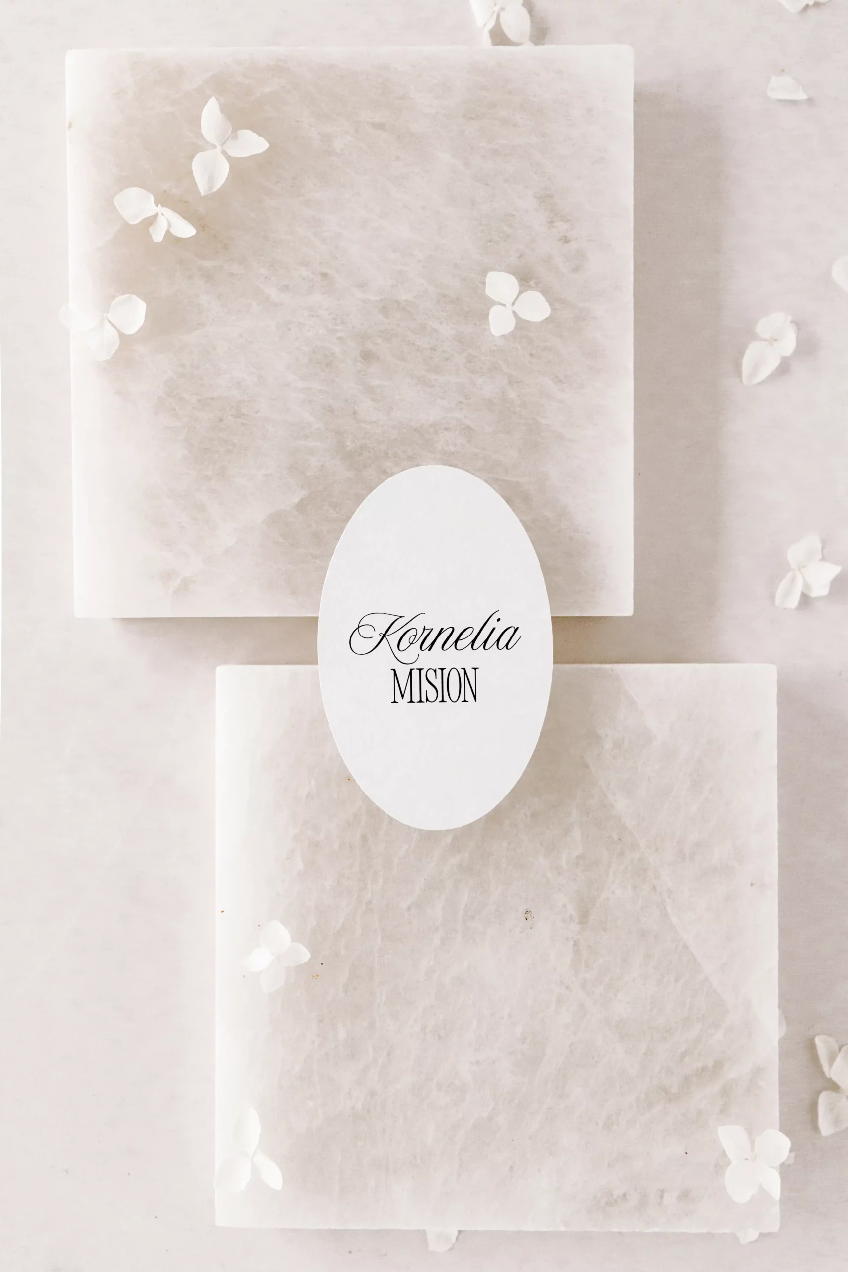 Delikatne, minimalistyczne winietki leżące z treścią drukowaną na fakturowanym papierze o gramaturze 250 g/m2 o owalnym kształcie.
