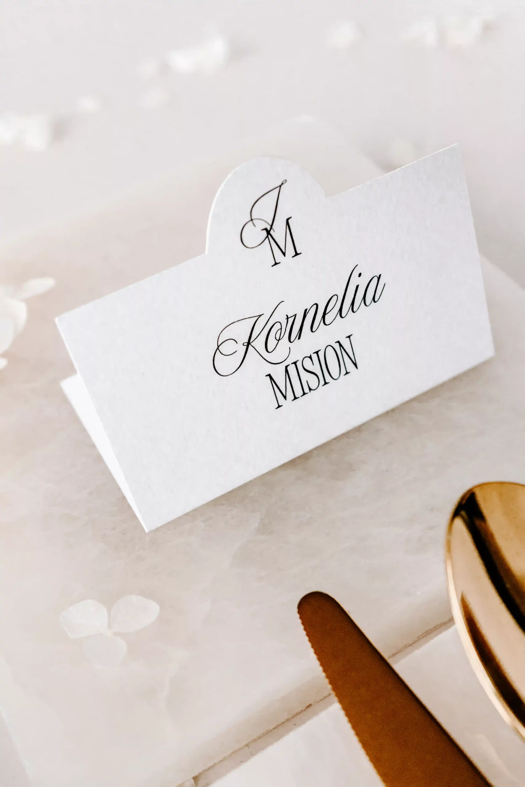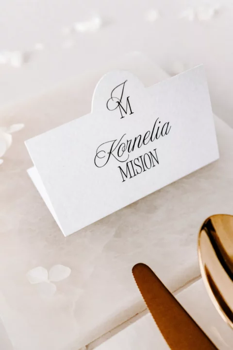 Delikatne, minimalistyczne winietki stojące z treścią drukowaną na fakturowanym papierze o gramaturze 250 g/m2, z ozdobnymi inicjałami pary młodej