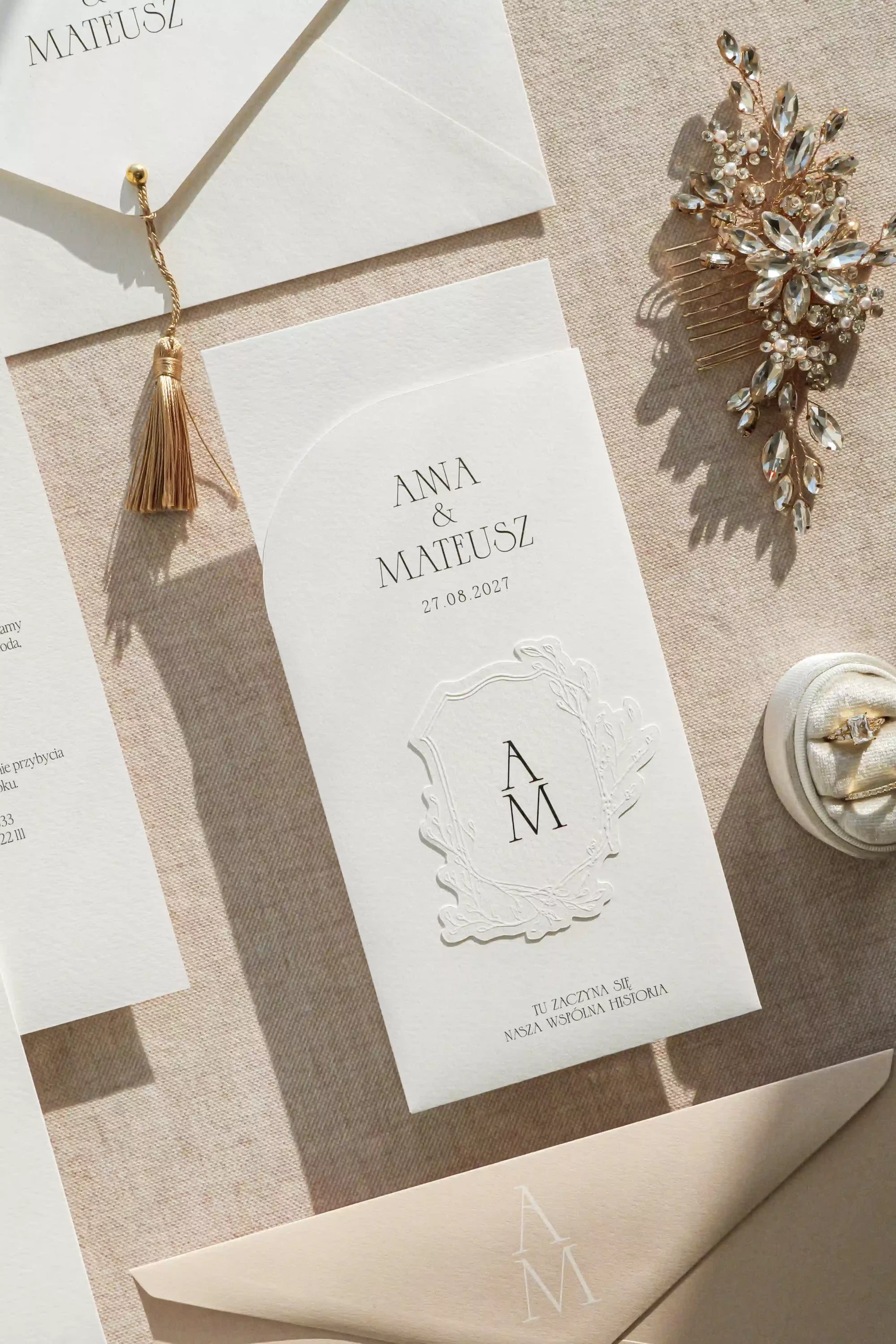Jedno- lub dwukartowe zaproszenie z treścią drukowaną na fakturowanym papierze o gramaturze 250 g/m2 na kartach umieszczonych w ozdobnym folderze z tłoczonym herbem z inicjałami pary młodej.