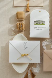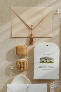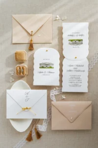 Na zdjęciach prócz zaproszenia widoczne są dwie koperty z różnymi możliwościami druku, pierwszy przykładowy wariant z drukiem na froncie, drugi na klapce koperty.