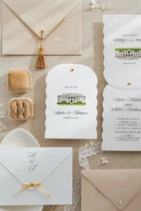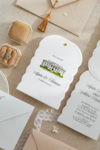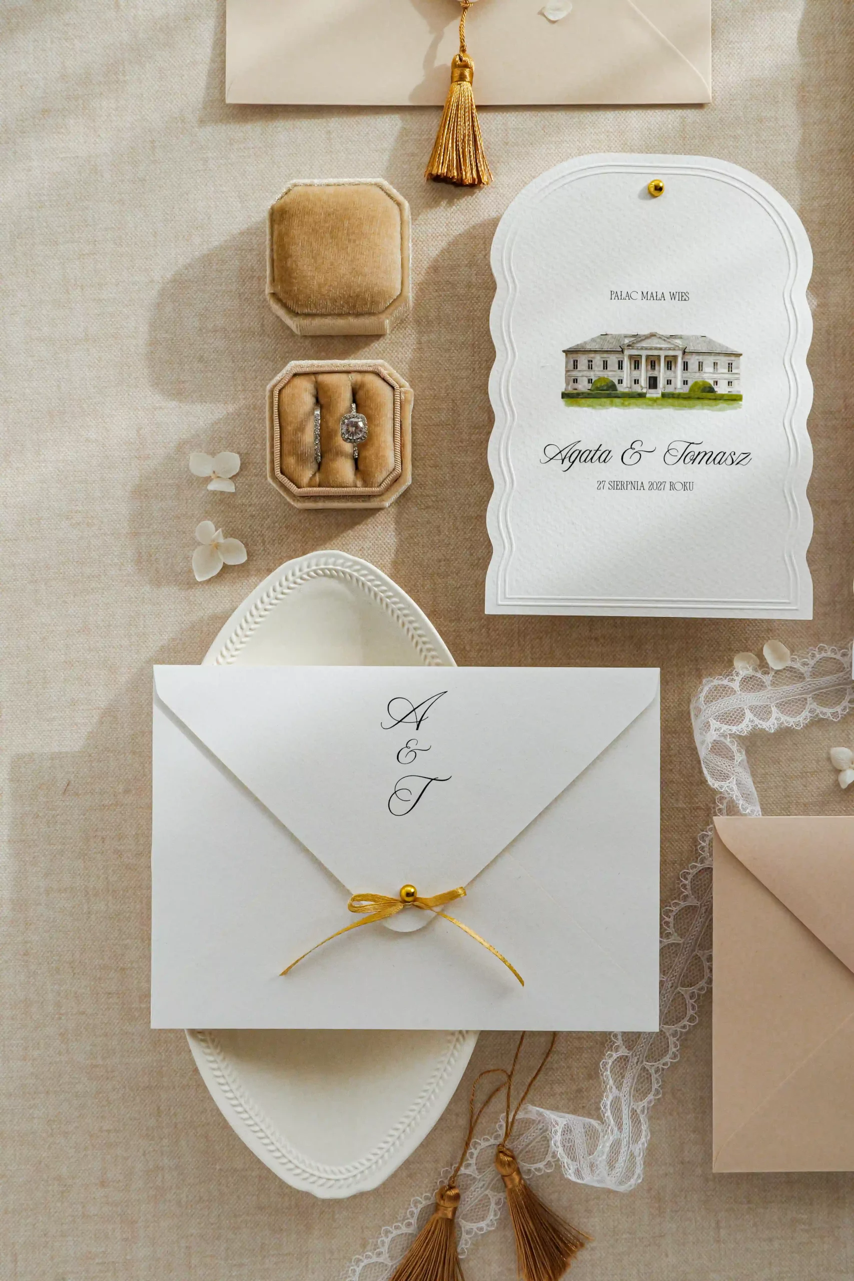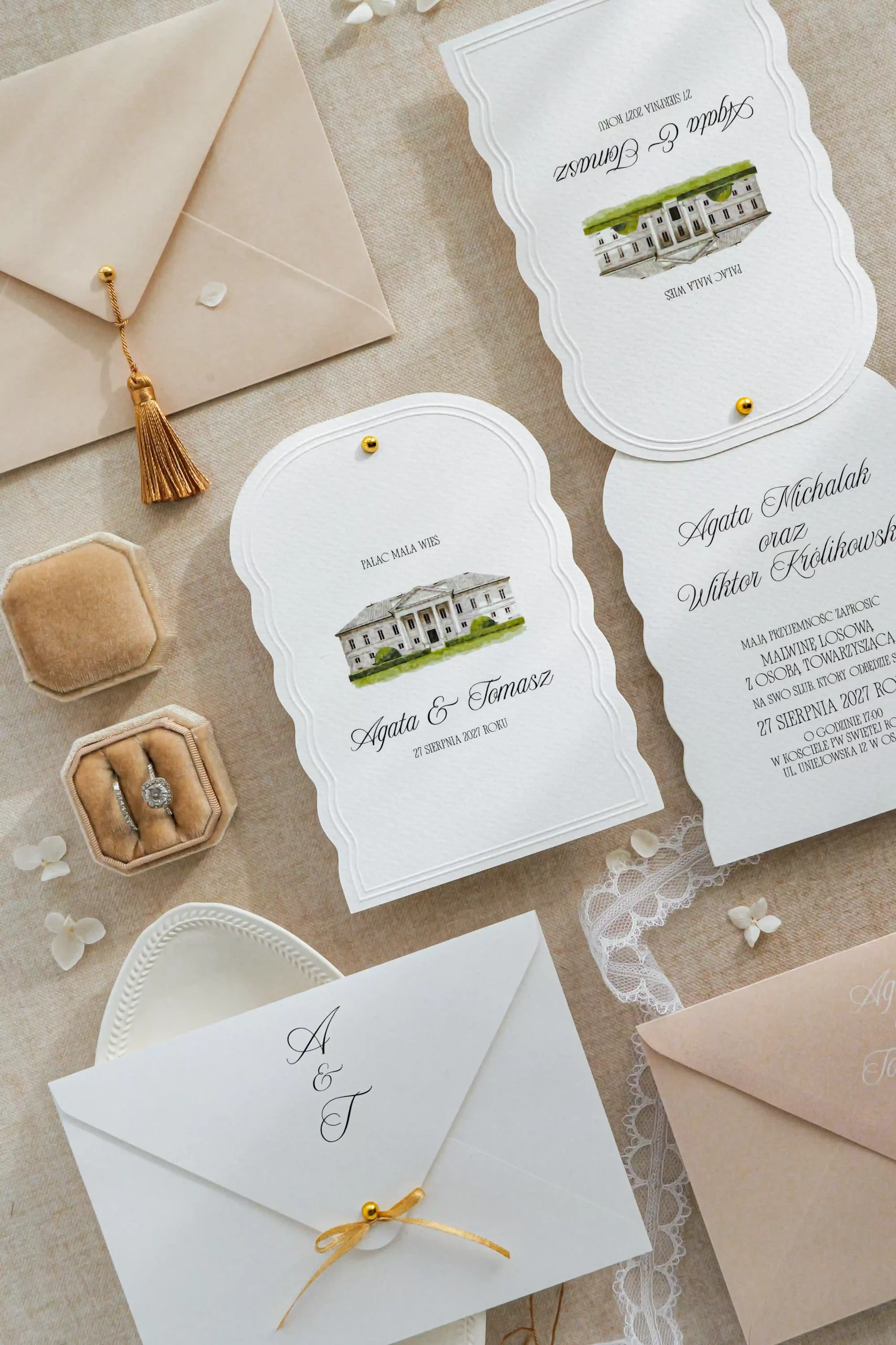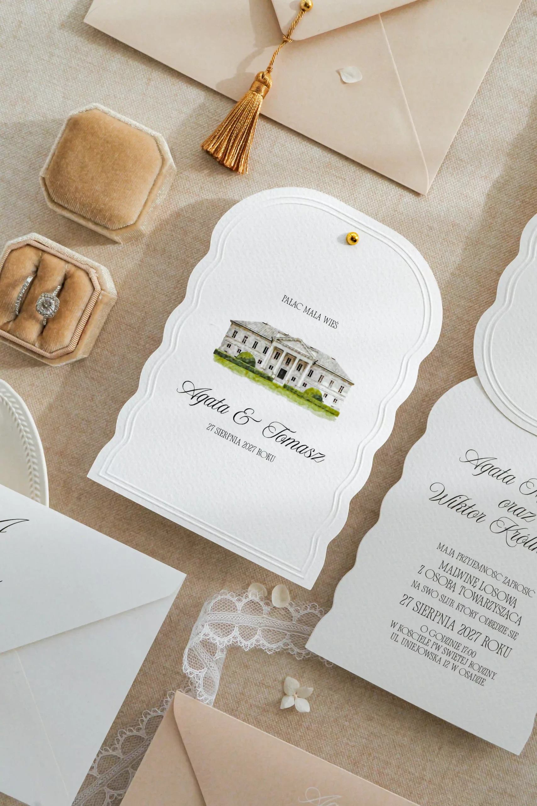 Rozsuwane, dwu- lub trzykartowe zaproszenie drukowane na fakturowanym papierze o gramaturze 250 g/m2. Frontowa karta wykończona tłoczeniem i grafiką z miejscem ślubu/wesela. Karty połączone złotym lub srebrnym elementem do wyboru.