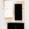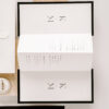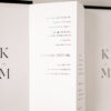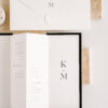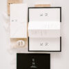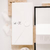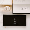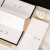 Rozkładane zaproszenie z treścią drukowaną na papierze w kolorze białym ukryte po złożeniu między dwoma bardzo sztywnymi, czarnymi kartami o gramaturze 700 g/m2