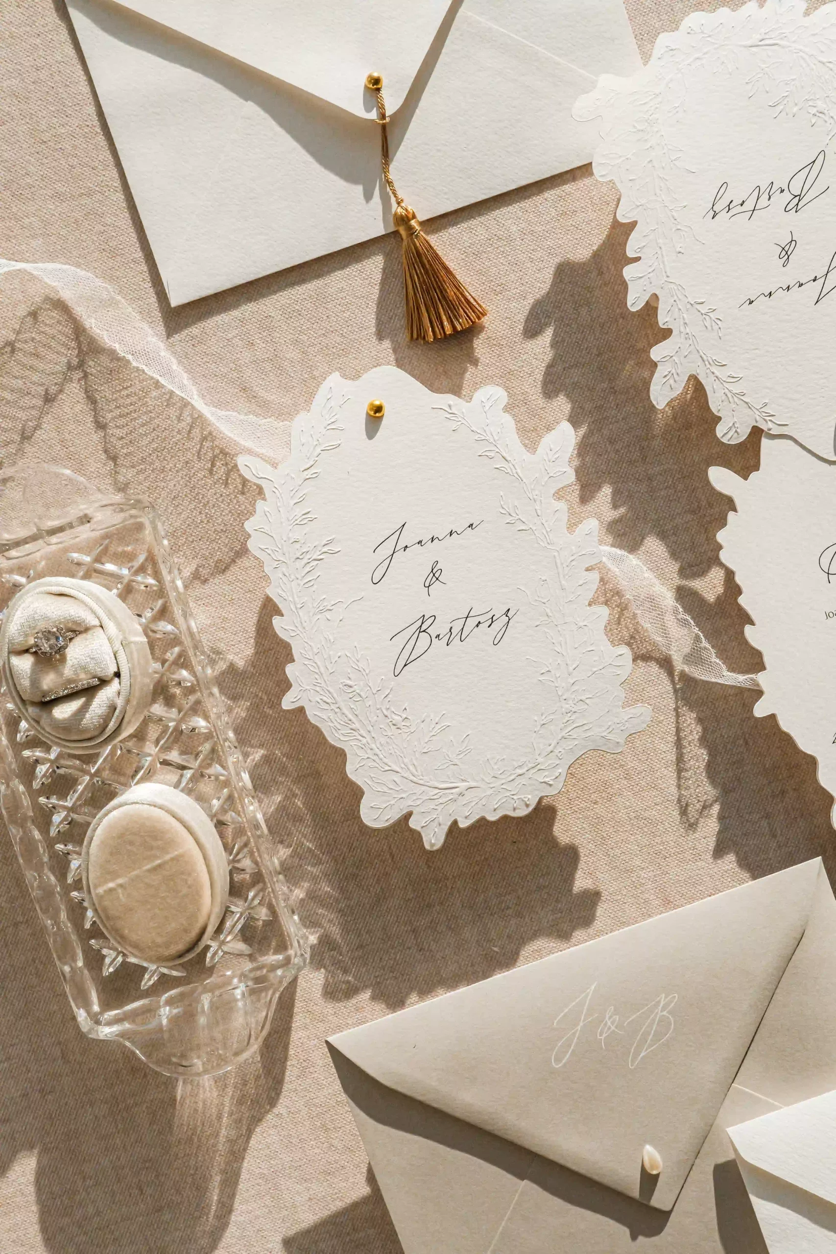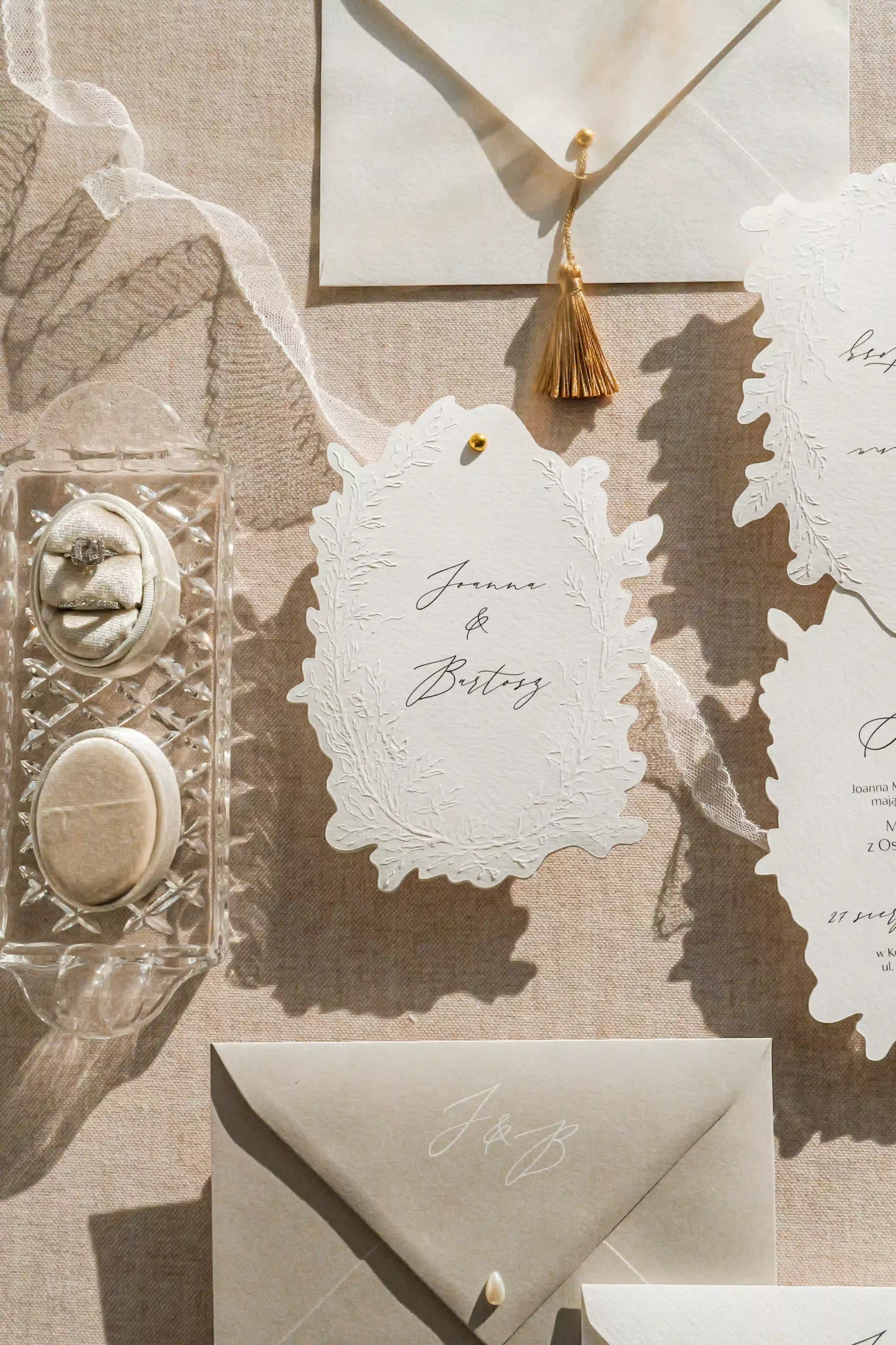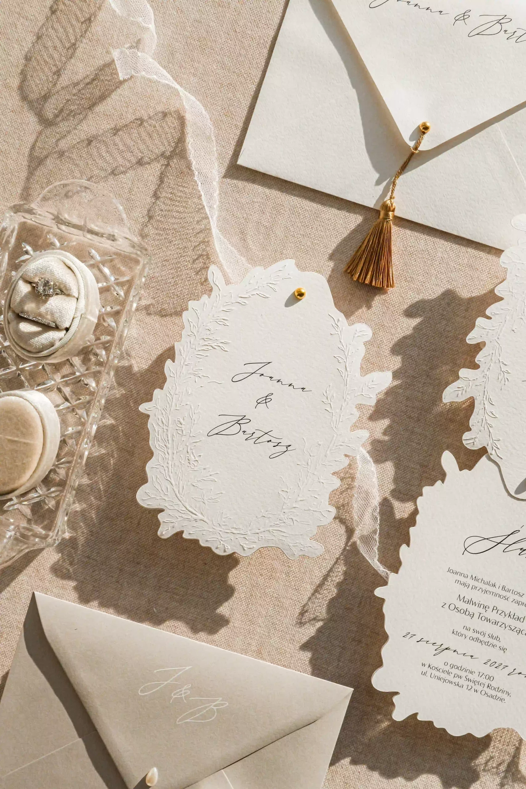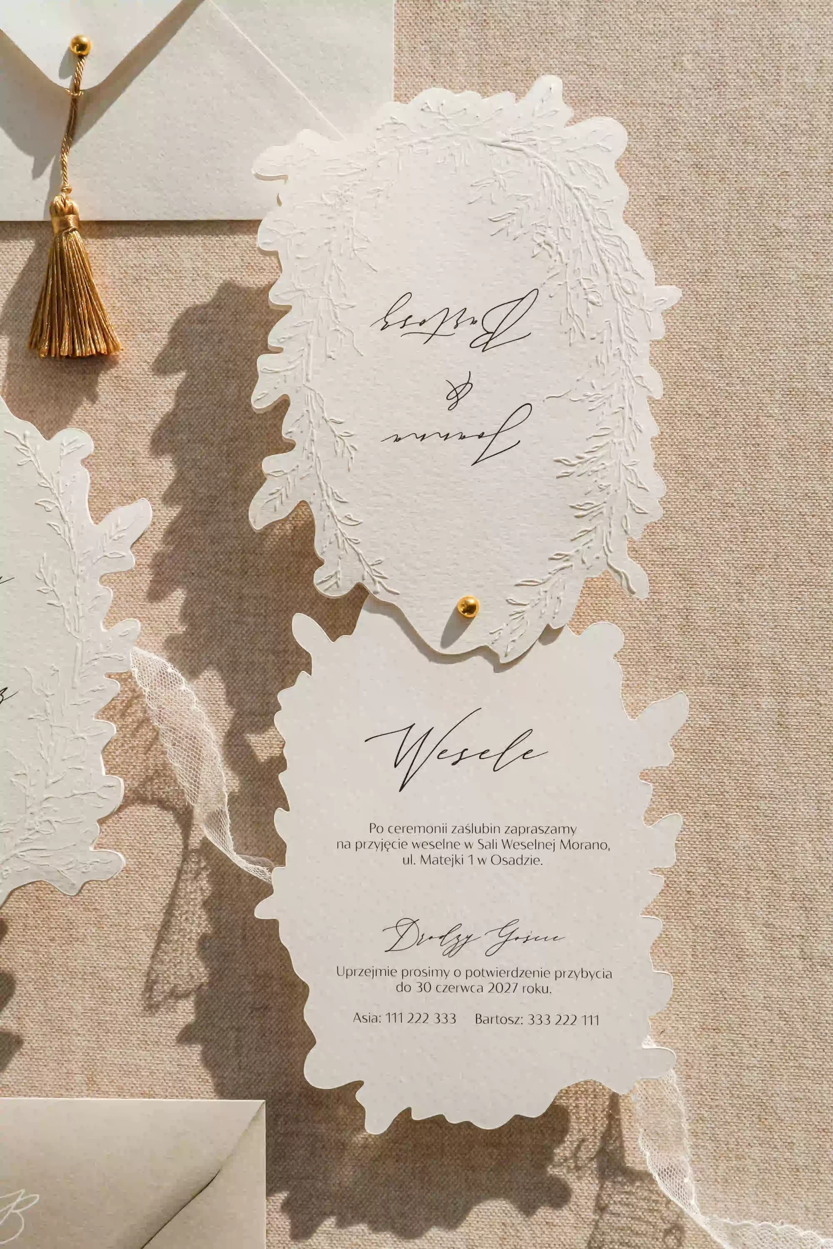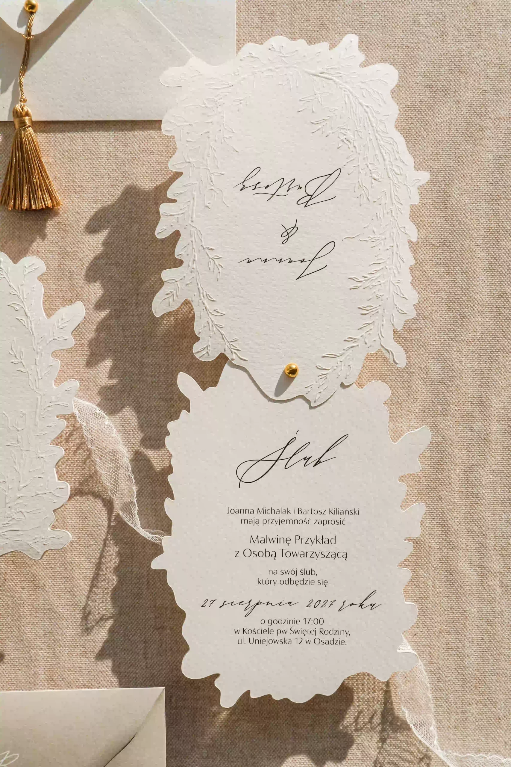 Dwu- lub trzykartowe zaproszenie z treścią drukowaną na fakturowanym papierze o gramaturze 250 g/m2 z ozdobnym florystycznym tłoczeniem na karcie frontowej oraz imionami pary młodej.