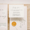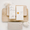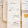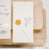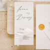 Minimalistyczne zaproszenie składające się z dwóch kart połączonych ręcznie przygotowaną jedwabną wstążką.