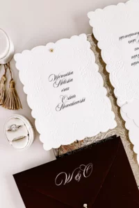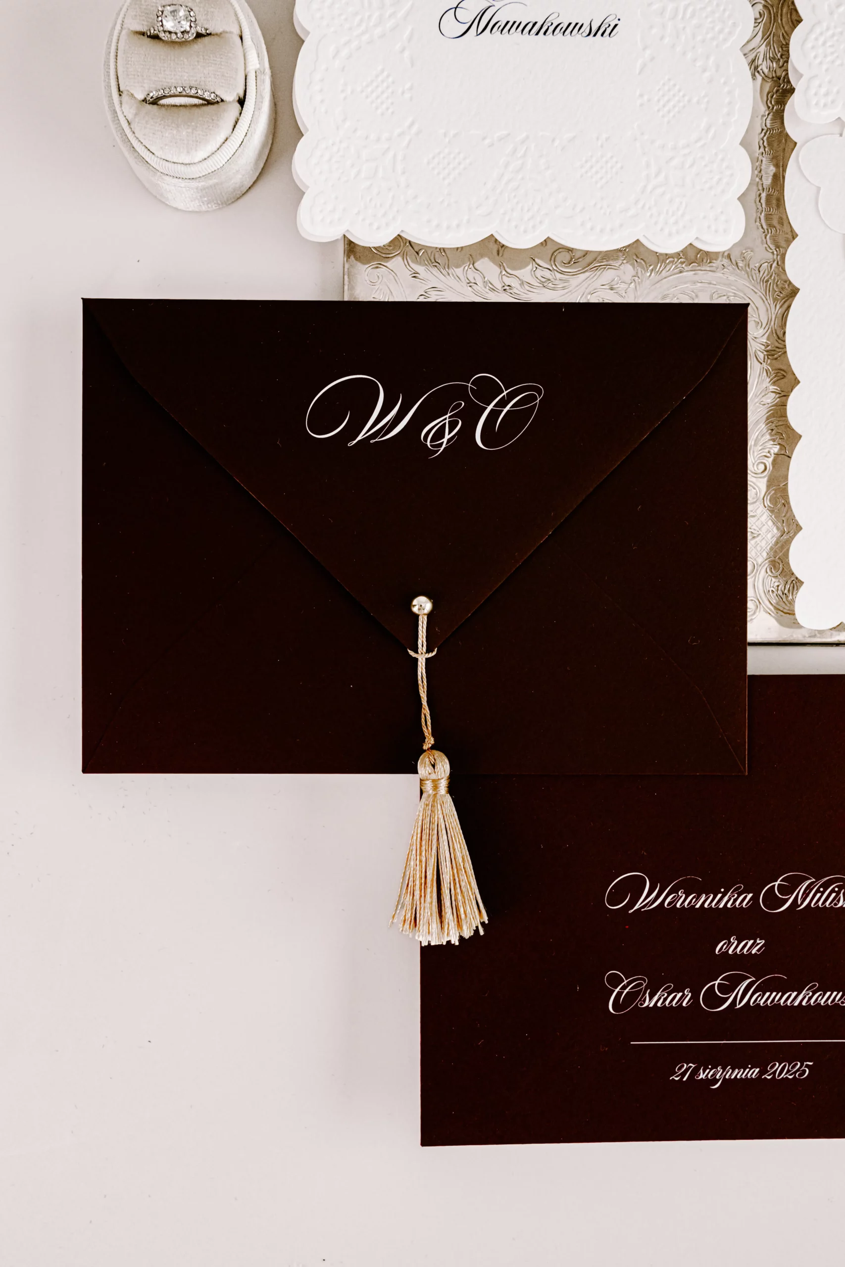 Na zdjęciach prócz zaproszenia widoczne są dwie koperty z różnymi możliwościami druku, pierwszy przykładowy wariant z drukiem na froncie, drugi na klapce koperty.