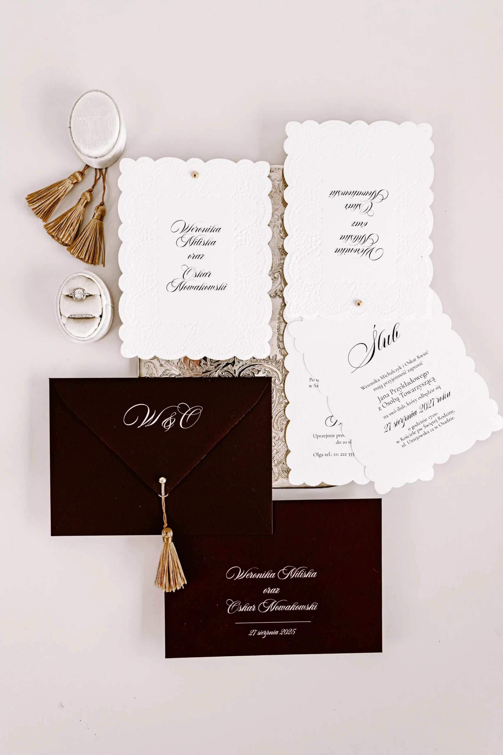 Rozsuwane, jedno- lub dwukartowe zaproszenie drukowane na fakturowanym papierze o gramaturze 250 g/m2. Frontowa karta wykończona koronkowym tłoczeniem. Karty połączone złotym lub srebrnym elementem do wyboru – w przypadku wariantu jednokartowego również jest w komplecie.