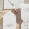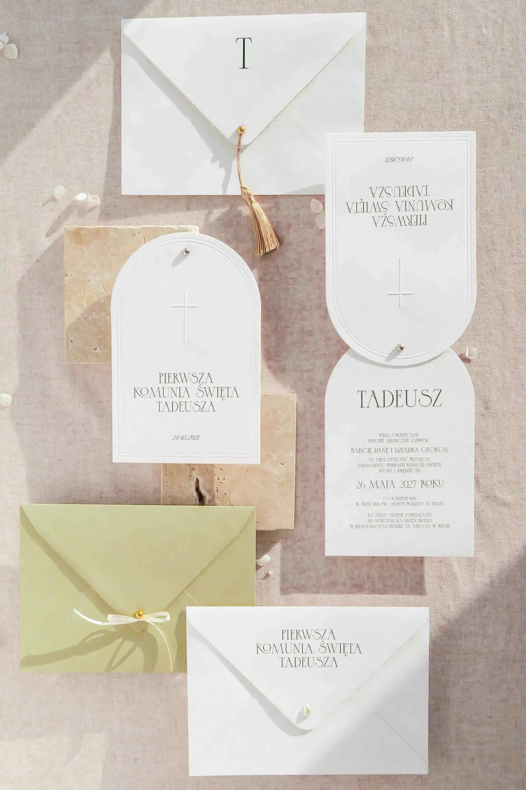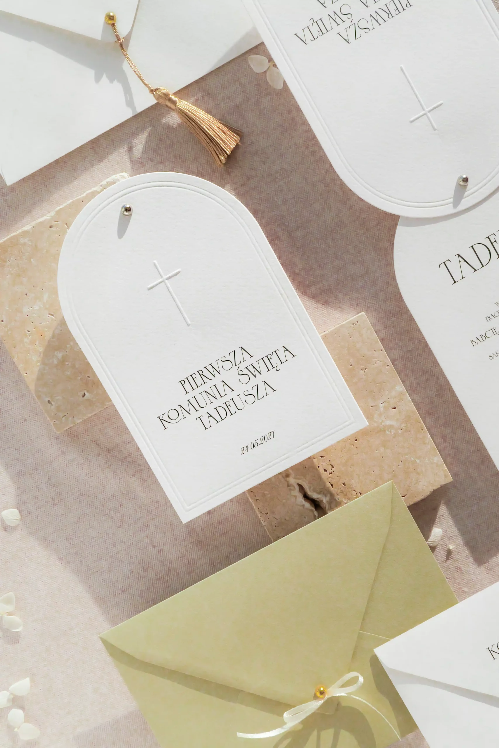 Rozsuwane, dwu- lub trzykartowe zaproszenie drukowane na fakturowanym papierze o gramaturze 250 g/m2. Frontowa karta wykończona tłoczoną ramką i motywem krzyżyka. Karty połączone złotym lub srebrnym elementem do wyboru.