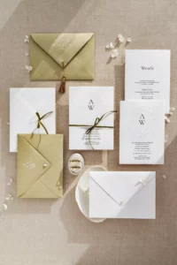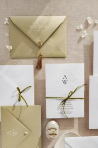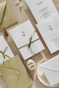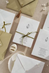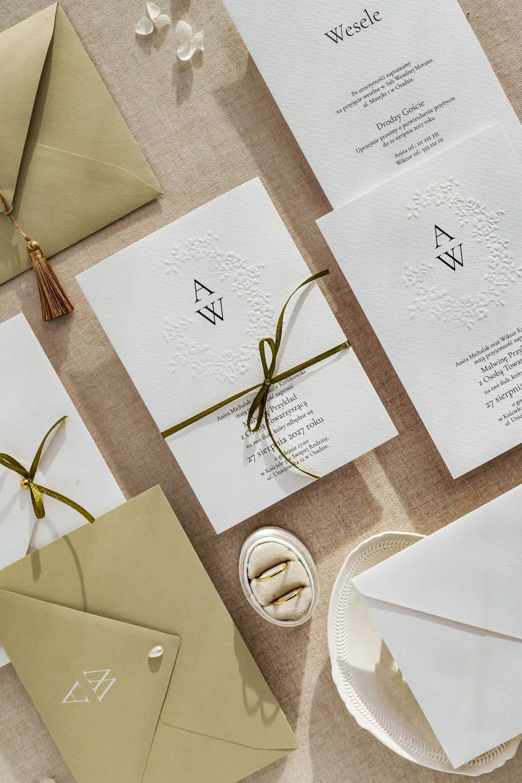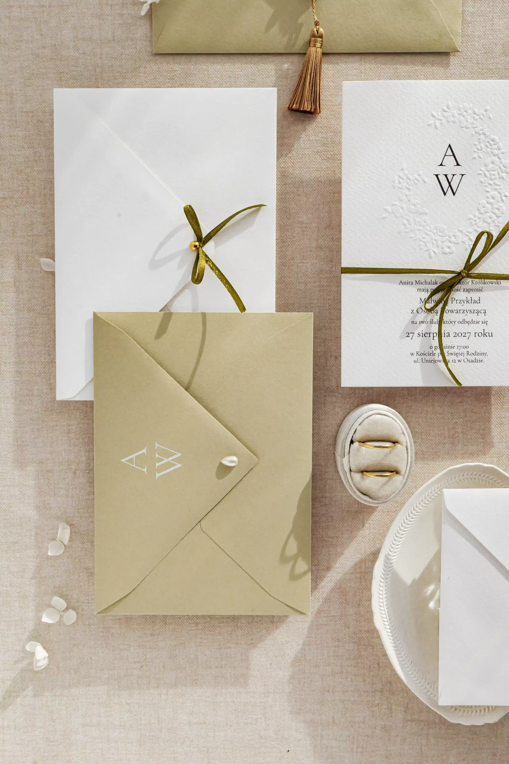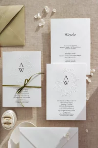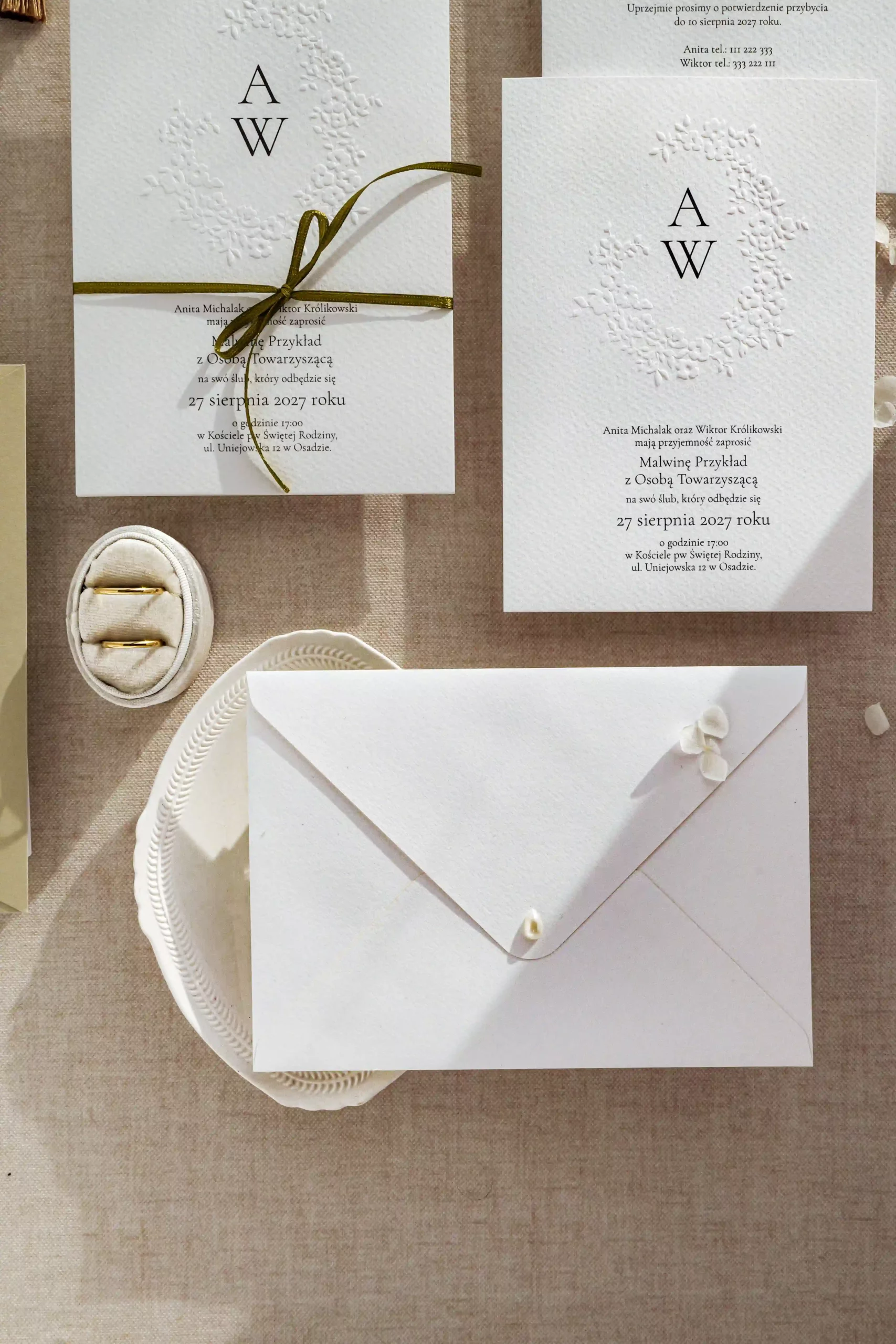 jedno- lub dwukartowe zaproszenie drukowane na fakturowanym papierze o gramaturze 250 g/m2. Pierwsza karta wykończona tłoczeniem i inicjałami pary młodej. Całość przewiązana wstążką w wybranym kolorze.