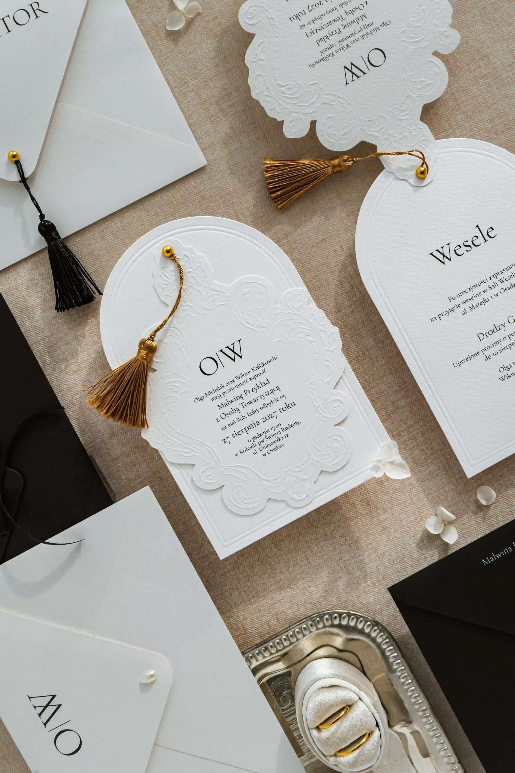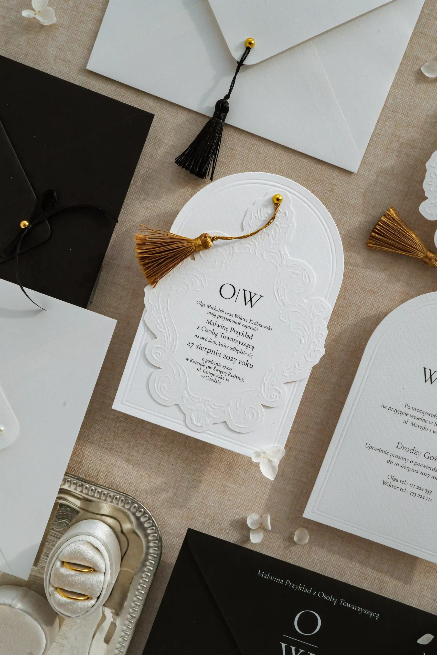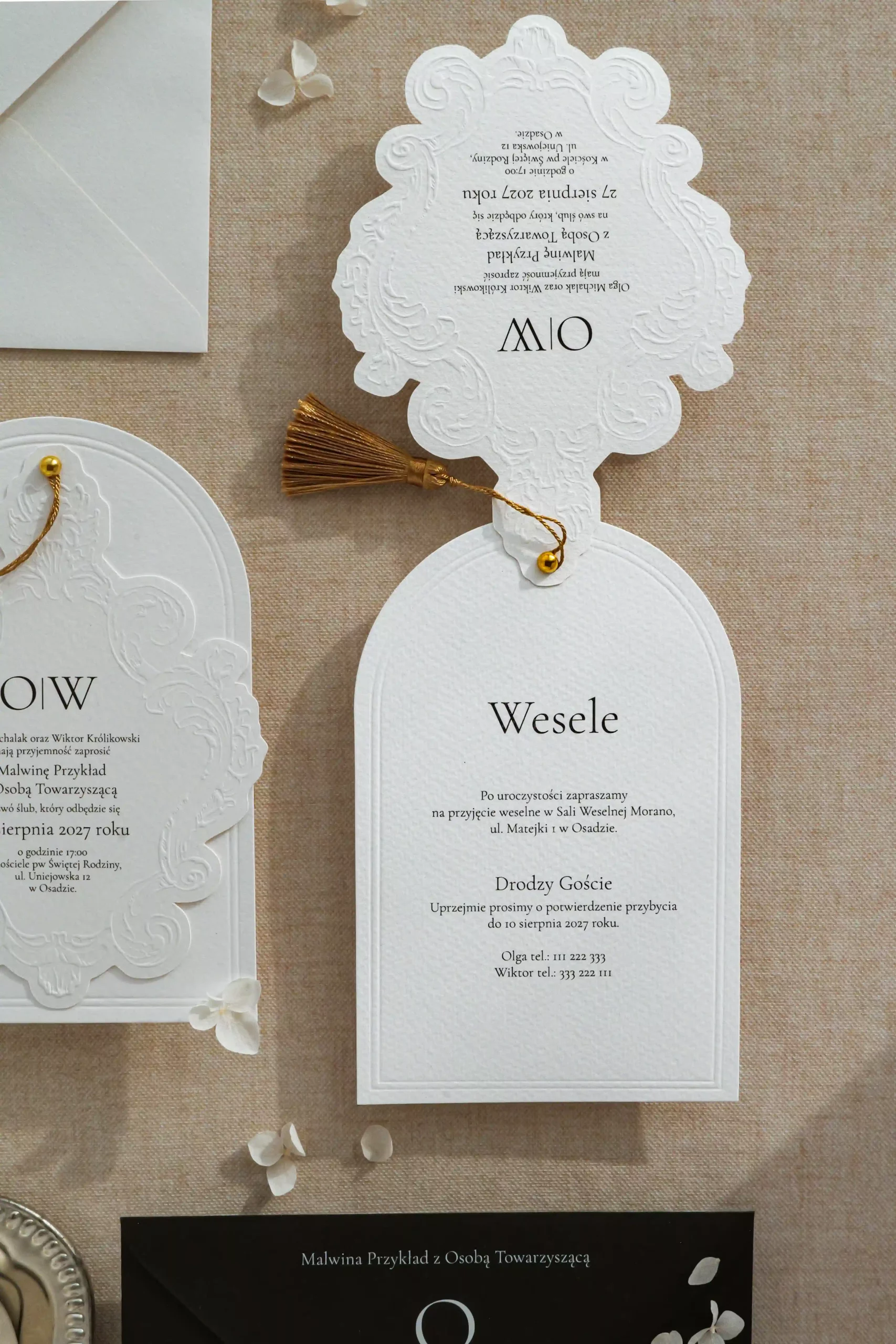 Dwukartowe zaproszenie drukowane na fakturowanym papierze o gramaturze 250 g/m2. Karty zaproszenia wykończone tłoczeniem.