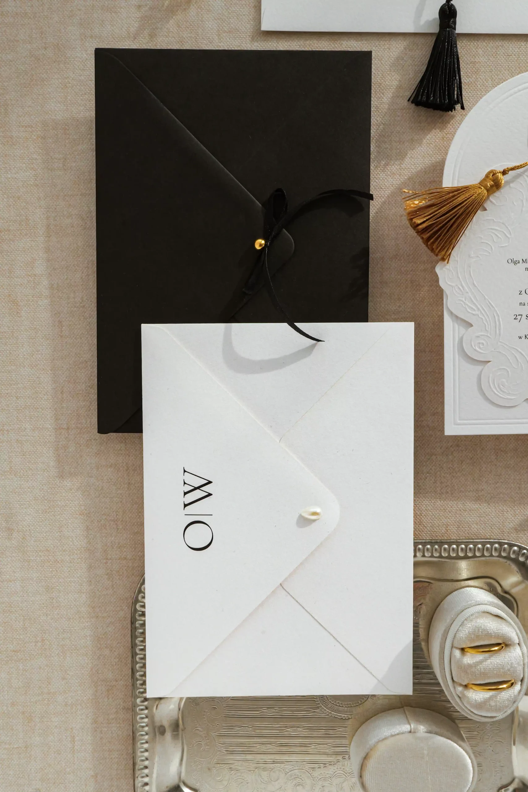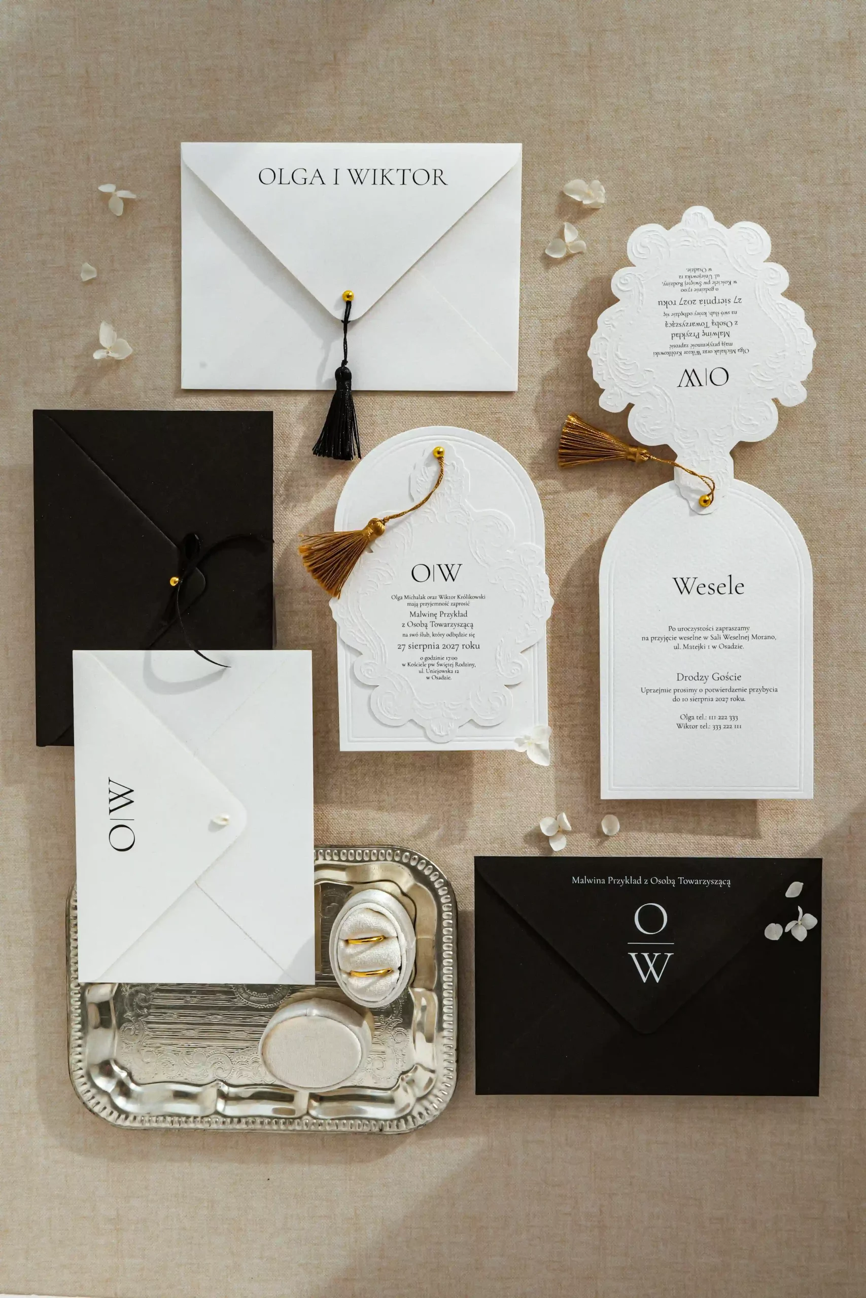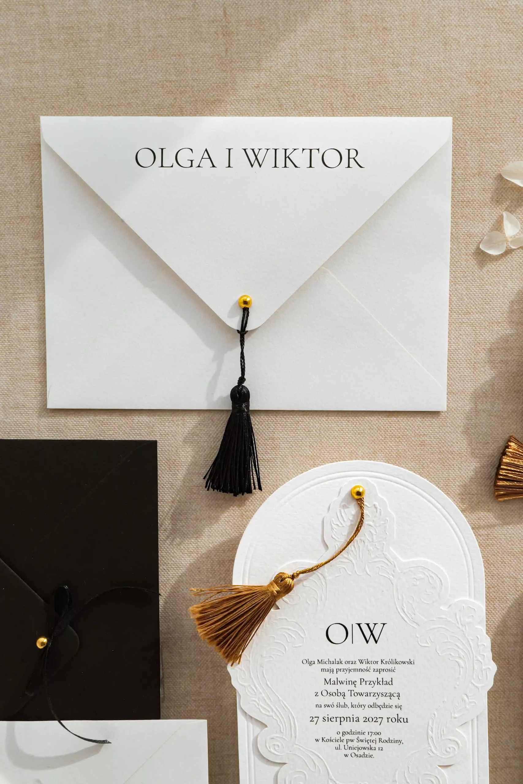 Dwukartowe zaproszenie drukowane na fakturowanym papierze o gramaturze 250 g/m2. Karty zaproszenia wykończone tłoczeniem.