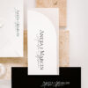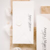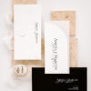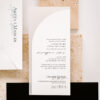 Minimalistyczne, dwustronne zaproszenie z treścią drukowaną na fakturowanym papierze o gramaturze 250 g/m2 w zaokrąglonym oryginalnym kształcie. Tło z półtransparentnego, mlecznego papieru.