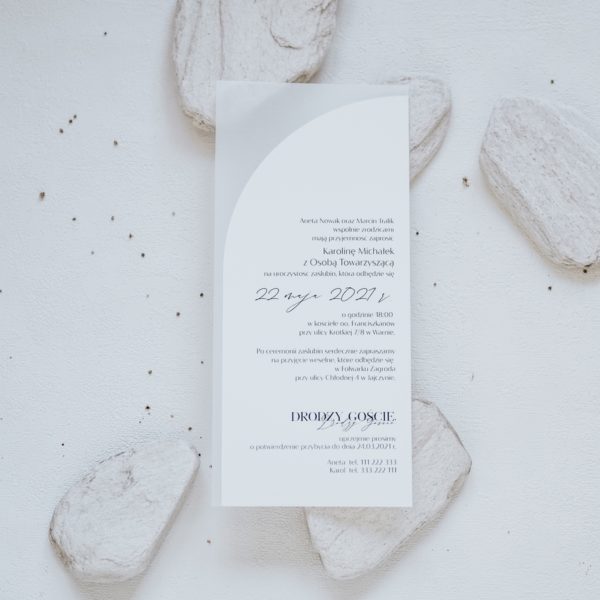 Minimalistyczne, dwustronne zaproszenie z treścią drukowaną na fakturowanym papierze o gramaturze 250 g/m2 w zaokrąglonym oryginalnym kształcie. Tło z półtransparentnego, mlecznego papieru.